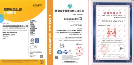 結(jié)合2019年取得的質(zhì)量管理體系(ISO9001),鄭房測繪已成功通過“三標體系”認證。這些榮譽,不僅是公司在規(guī)范化運營、風險防控、精細化管理等維度交出的優(yōu)異答卷,更標志著公司企業(yè)綜合實力和核心競爭力的增強,顯著提升公司品牌形象與市場信譽度,增強客戶對企業(yè)的信任,為深耕測繪地理信息市場奠定堅實基礎(chǔ),為開啟管理升級與戰(zhàn)略躍升譜寫新篇章。