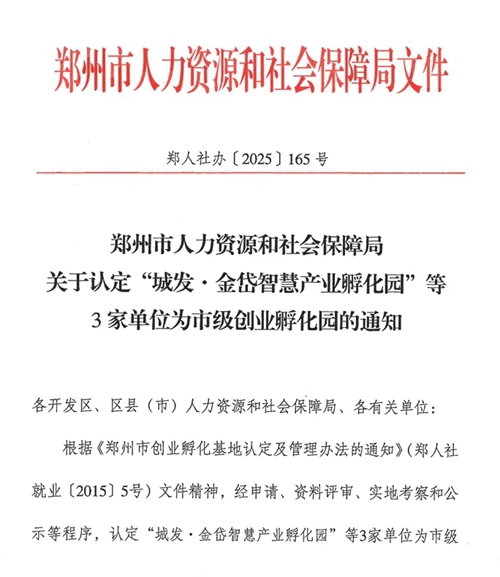 近日,鄭州市人力資源和社會保障局發(fā)布關(guān)于認(rèn)定“城發(fā)·金岱智慧產(chǎn)業(yè)孵化園”等3家單位為市級創(chuàng)業(yè)孵化園的通知。根據(jù)《鄭州市創(chuàng)業(yè)孵化基地及管理辦法的通知》(鄭人社就業(yè)〔2015〕5號)文件精神,經(jīng)申請、資料評審、實地考察和公示等程序,認(rèn)定“城發(fā)·金岱智慧產(chǎn)業(yè)孵化園”等3家單位為市級創(chuàng)業(yè)孵化園,并頒發(fā)鄭州市創(chuàng)業(yè)孵化園榮譽牌匾。