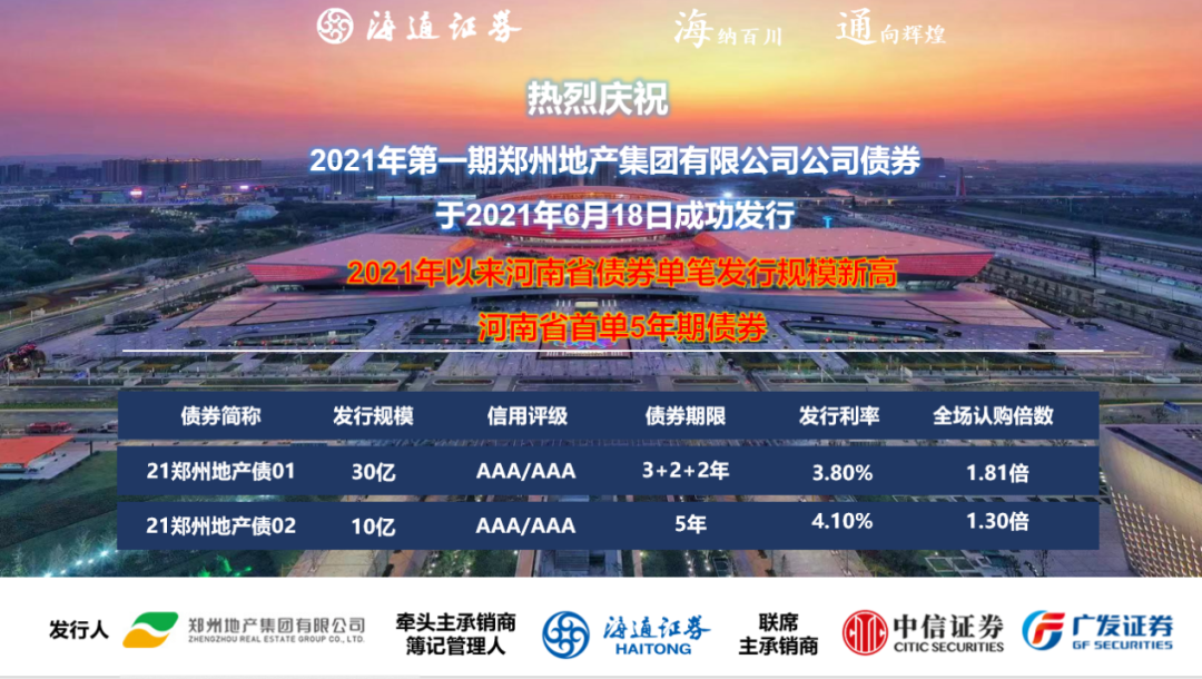 黨史學(xué)習(xí)教育在鄭州地產(chǎn)集團(tuán)如火如荼開展,集團(tuán)黨委在鄭州市委、市政府的領(lǐng)導(dǎo)下,在鄭州市國資委黨委的監(jiān)管下,在學(xué)黨史、悟初心的基礎(chǔ)上,將“辦實(shí)事、解難題”作為黨史學(xué)習(xí)教育的重要內(nèi)容,充分釋放黨建紅色生產(chǎn)力,推進(jìn)黨史教育深入業(yè)務(wù)實(shí)踐,引領(lǐng)業(yè)務(wù)高質(zhì)量發(fā)展。在集團(tuán)黨委的堅(jiān)強(qiáng)領(lǐng)導(dǎo)下,鄭州地產(chǎn)集團(tuán)6月18日成功發(fā)行第一期優(yōu)質(zhì)企業(yè)債券40億元,3+2+2年期產(chǎn)品發(fā)行利率3.8%,5年期產(chǎn)品發(fā)行利率4.1%。本次發(fā)行創(chuàng)河南省首單5年期企業(yè)債券,創(chuàng)2021年以來河南省債券單筆發(fā)行規(guī)模新高,是鄭州地產(chǎn)集團(tuán)資本市場融資工具的又一創(chuàng)新探索!